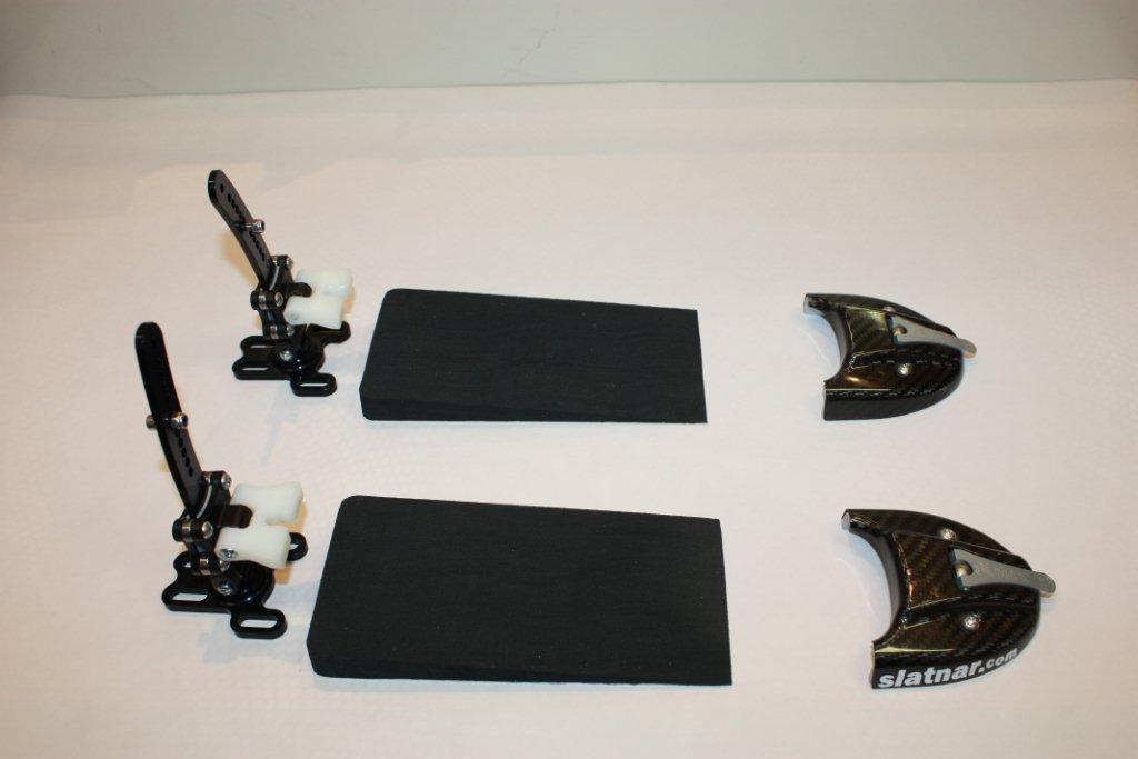 Slatnars nyeste binding. Med disse kommer skiene raskere ut i V stilling. Roterende stag sikrer raskere utløsning fra bindingene ved fall. Her med carbon frontdeksel og foamklosser.
